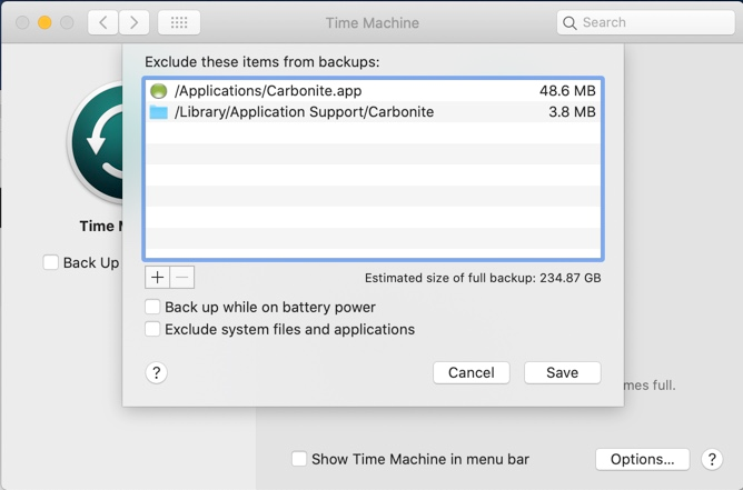 - Navigate to /Library/Application Support/ and select Carbonite. With the folder selected, click Exclude to exclude it from your Time Machine backups.