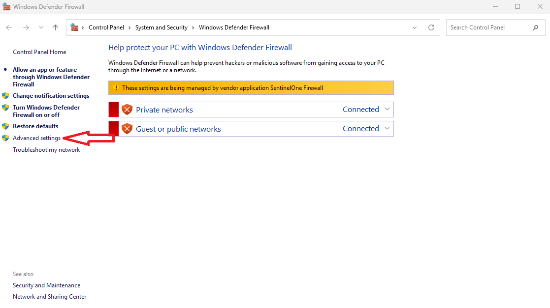 After searching for Windows Defender Firewall, you will see the application populate on the list of options. Click on the application to open it. Once opened click the "Advanced settings" link on the left side list.