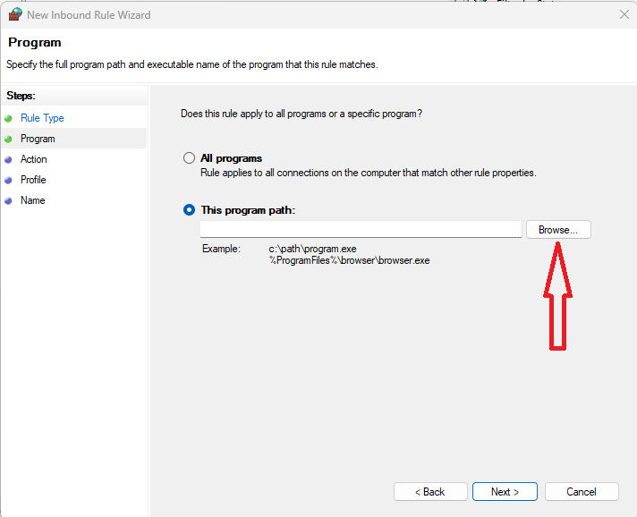 - Click the Browse button to search for files to add to the firewall's list of exceptions.