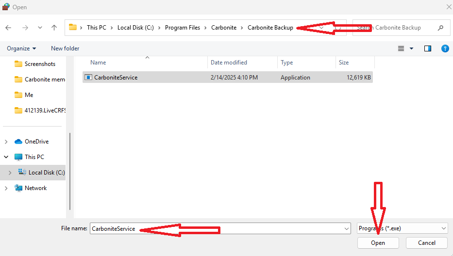 - Navigate to C:\Program Files\Carbonite\Carbonite Backup\ and select CarboniteService within the Browse window.