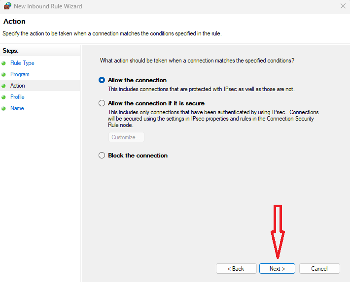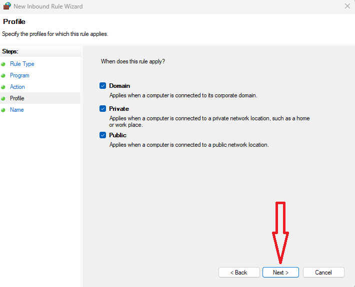 A new Windows box will appear. All needed settings for this process are automatically populated. No autogenerated settings have to be altered. You will input the New Inbound Rule Wizard to the Carbonite locations being added, and a name provided for each. In the Rule Wizard, please click Next.