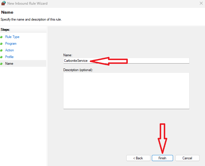 On the last page of the process you will be asked to name the exclusion. It would be recommended, to lessen any confusion, to name these "CarboniteService", "CarboniteUI", and "CarboniteSetup" as you are creating each of those rules, and then click Finish.