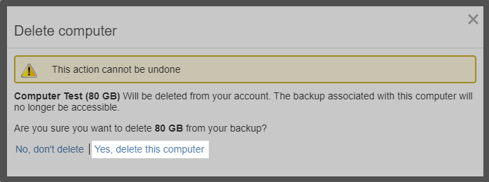 Please ensure you review the back up before proceeding to avoid unwanted data loss. When you delete a computer backup from the portal, the data will be removed from the servers immediately.